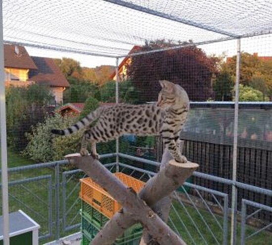 Stan ist eine Hauskatze, war noch nie Freigänger, genießt aber hier einen ca. 15m² großen, gesicherten Auslauf, wo er sich gern mal sonnt und die Vögel beobachtet.
